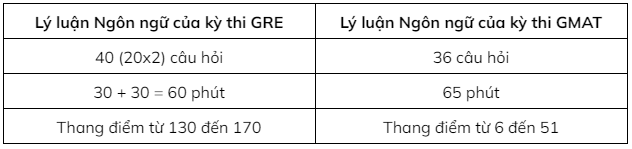 Kỳ thi GRE chú trọng kiểm tra từ vựng của bạn, trong khi kỳ thi GMAT tập trung hơn về phần ngữ pháp. GRE có hai phần Lý luận Ngôn ngữ còn GMAT chỉ có một.